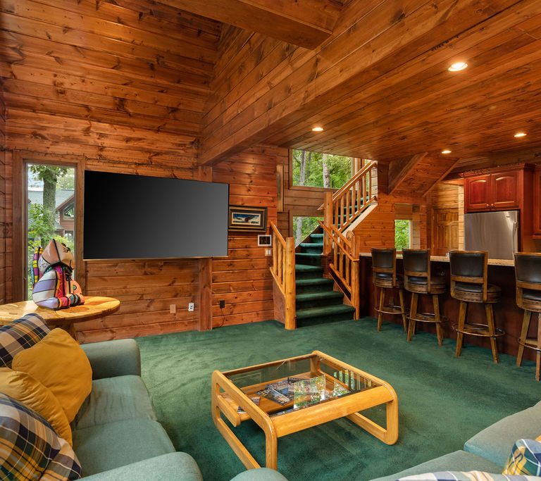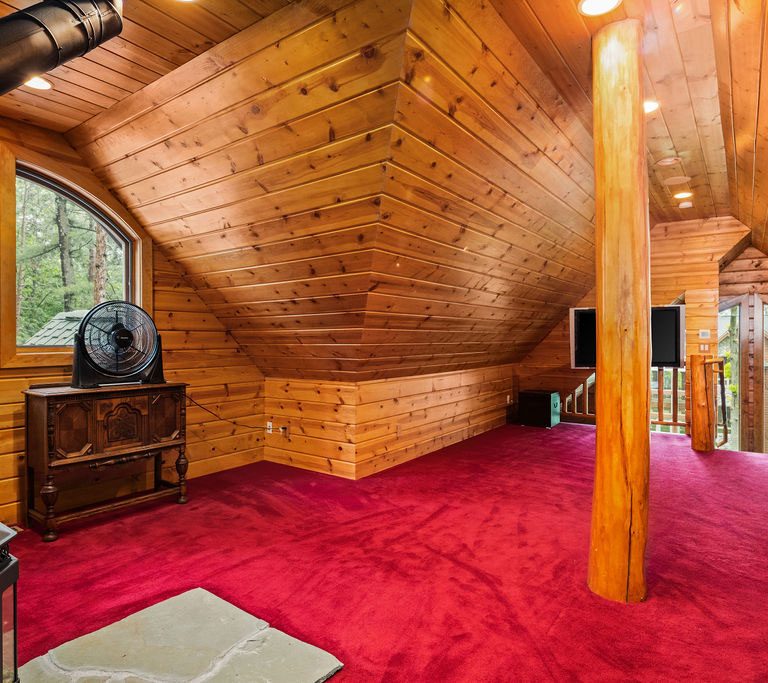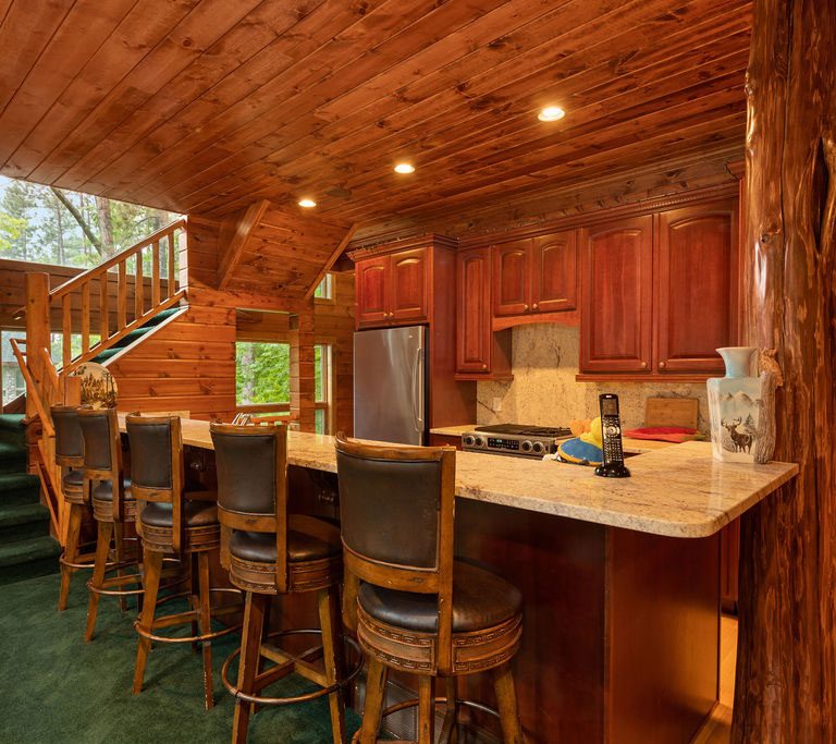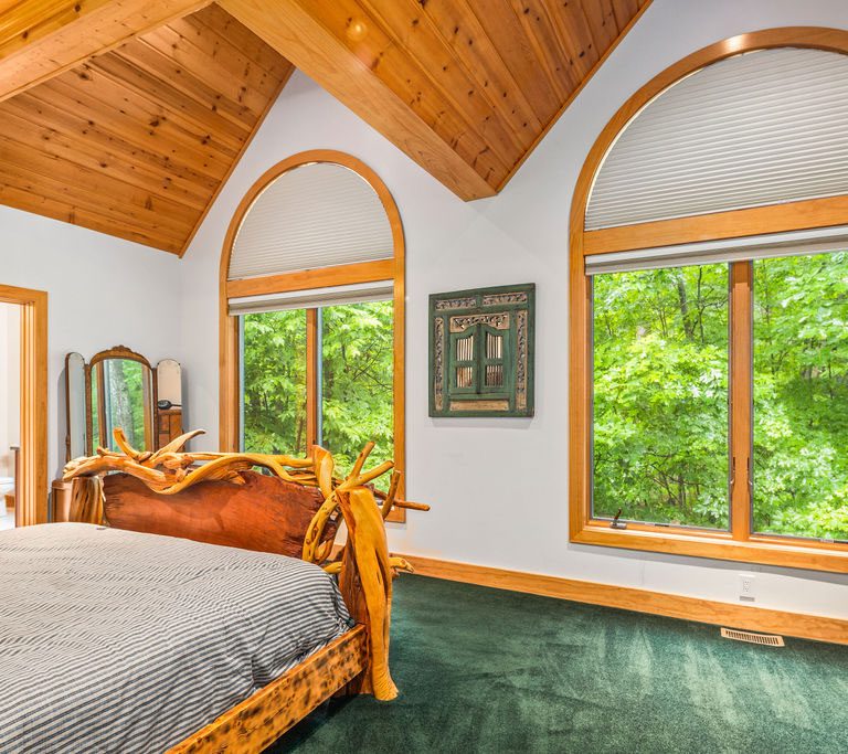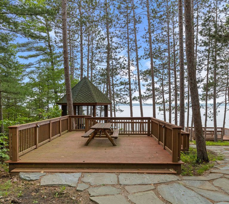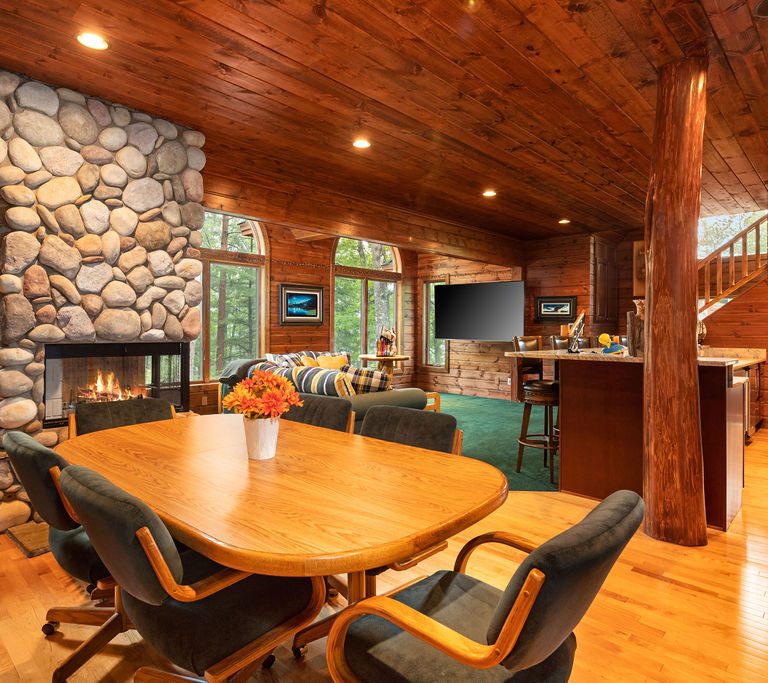 The living room includes a large-screen TV with satellite reception, a natural-burning three-sided fireplace, a dining room table for six, and a bar area that seats five. Most of the interior is finished in knotty pine. The kitchen has brand new, top-of-the-line appliances and is fully equipped with new dishes, pots and pans, cutlery, glasses, and other essentials. Satellite radio, FM/AM radio, and audio CDs can be played in every room of the house. The house gives a spectacular view of Mullett Lake and the woods of Red Pine Point.