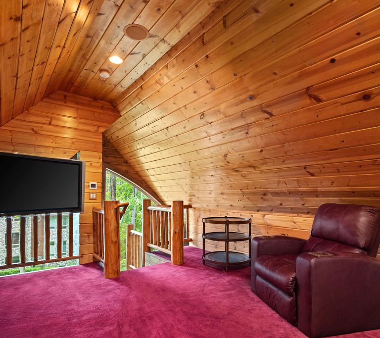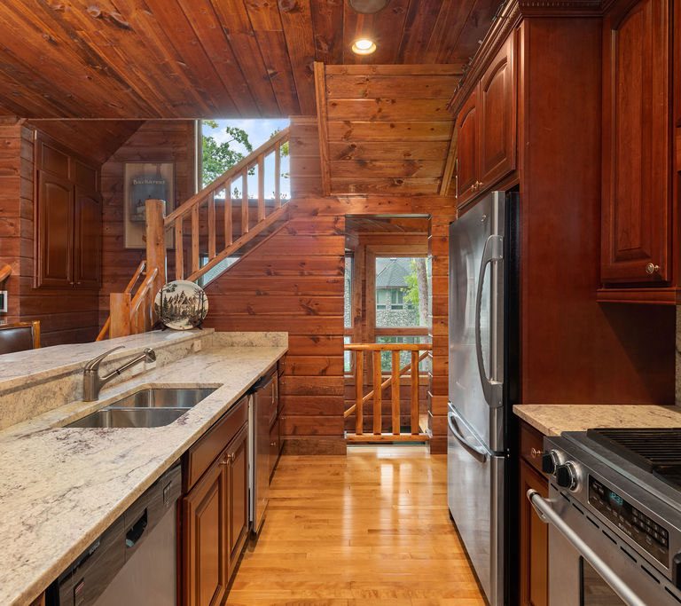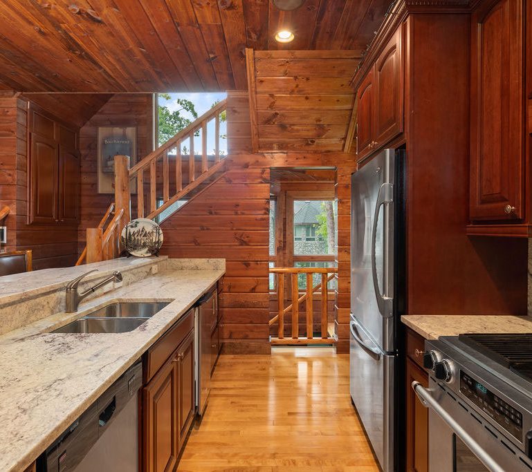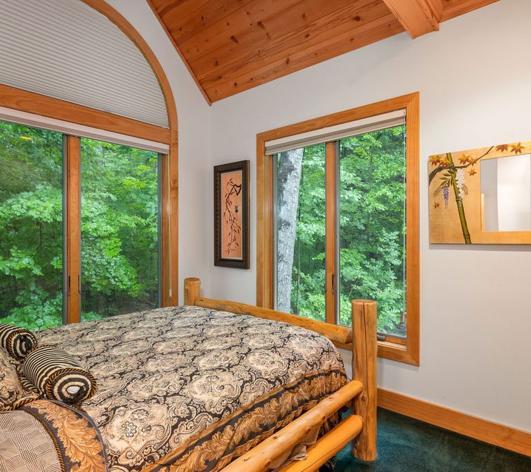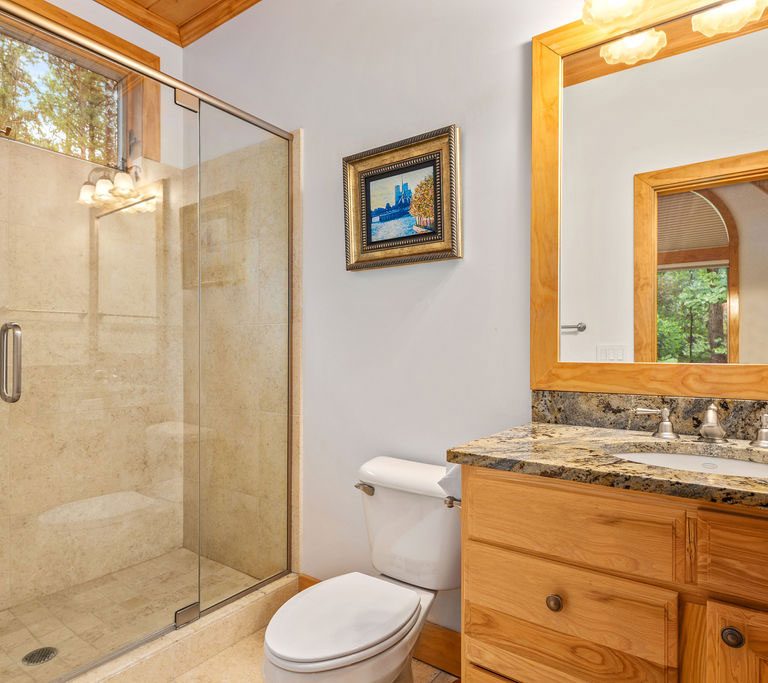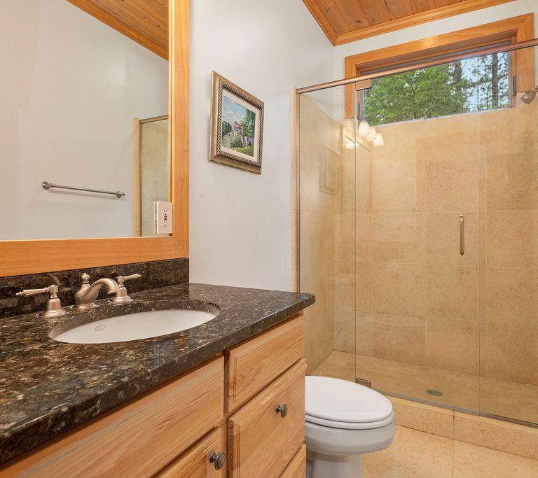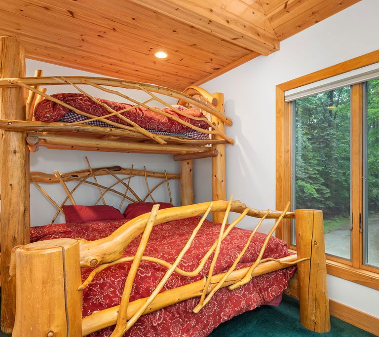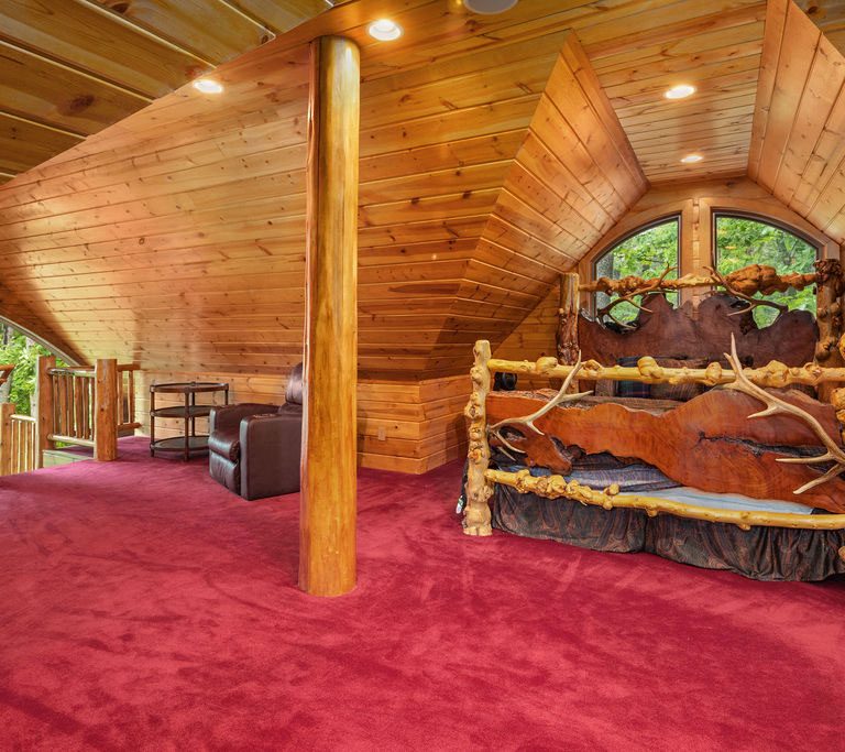 The carriage house includes four bedrooms. The master suite occupies the entire top floor and includes a gas burning stove, a brand new king-sized burl wood bed, satellite TV, and a bathroom finished in top-of-the-line granite and limestone with a full-sized Jacuzzi tub, two vanities, and a stand-up shower with full body spray and euro glass. Two of the other bedrooms include their own unique king-sized beds. The last bedroom is a bunk bed with a queen-sized mattress. All three downstairs bedrooms have their own bathrooms, each finished uniquely in limestone and granite.